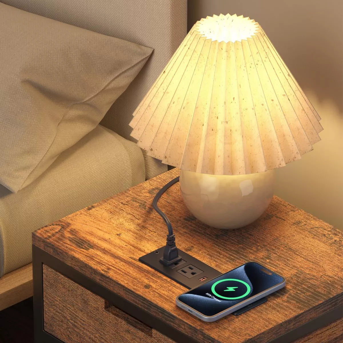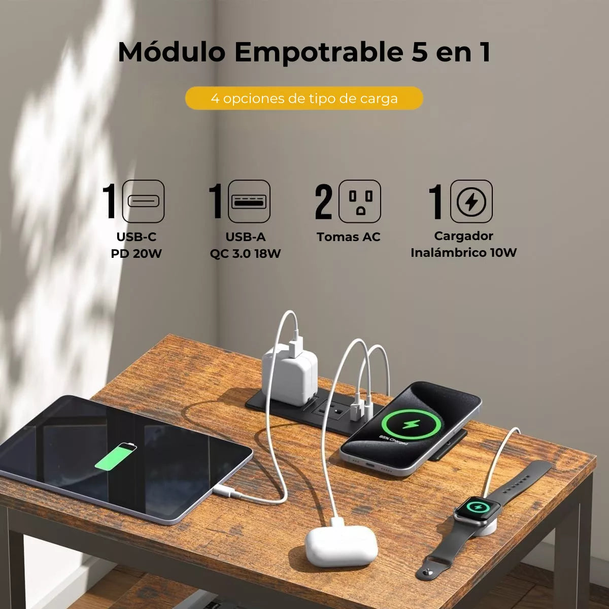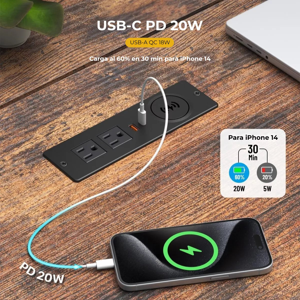 Este elegante toma corriente combina carga inalámbrica de 10W, puertos USB de alta velocidad y tomas de corriente, todo en un diseño moderno y empotrable que se integra perfectamente en cualquier mueble o espacio de trabajo.