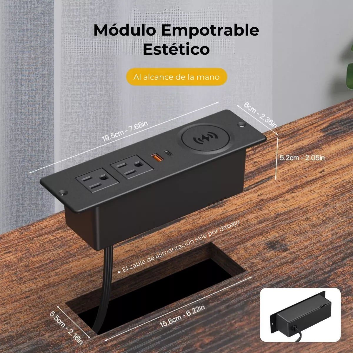 Este elegante toma corriente combina carga inalámbrica de 10W, puertos USB de alta velocidad y tomas de corriente, todo en un diseño moderno y empotrable que se integra perfectamente en cualquier mueble o espacio de trabajo.